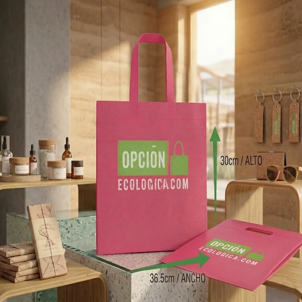 Bolsa ecológica non woven de 36.5 x 30 cm, perfecta para promociones y eventos. Resistente y reutilizable, ideal para cuidar el planeta con estilo.